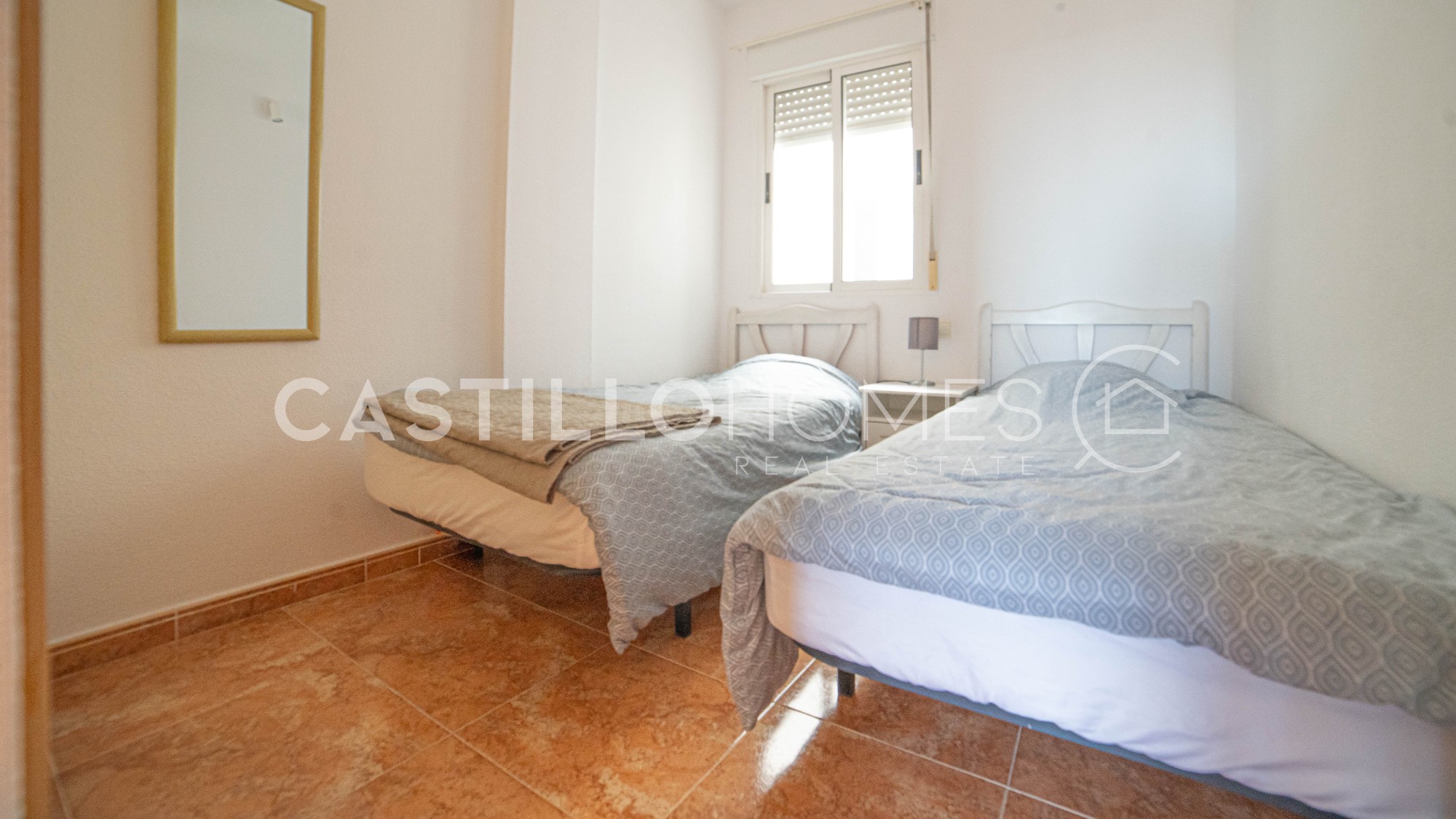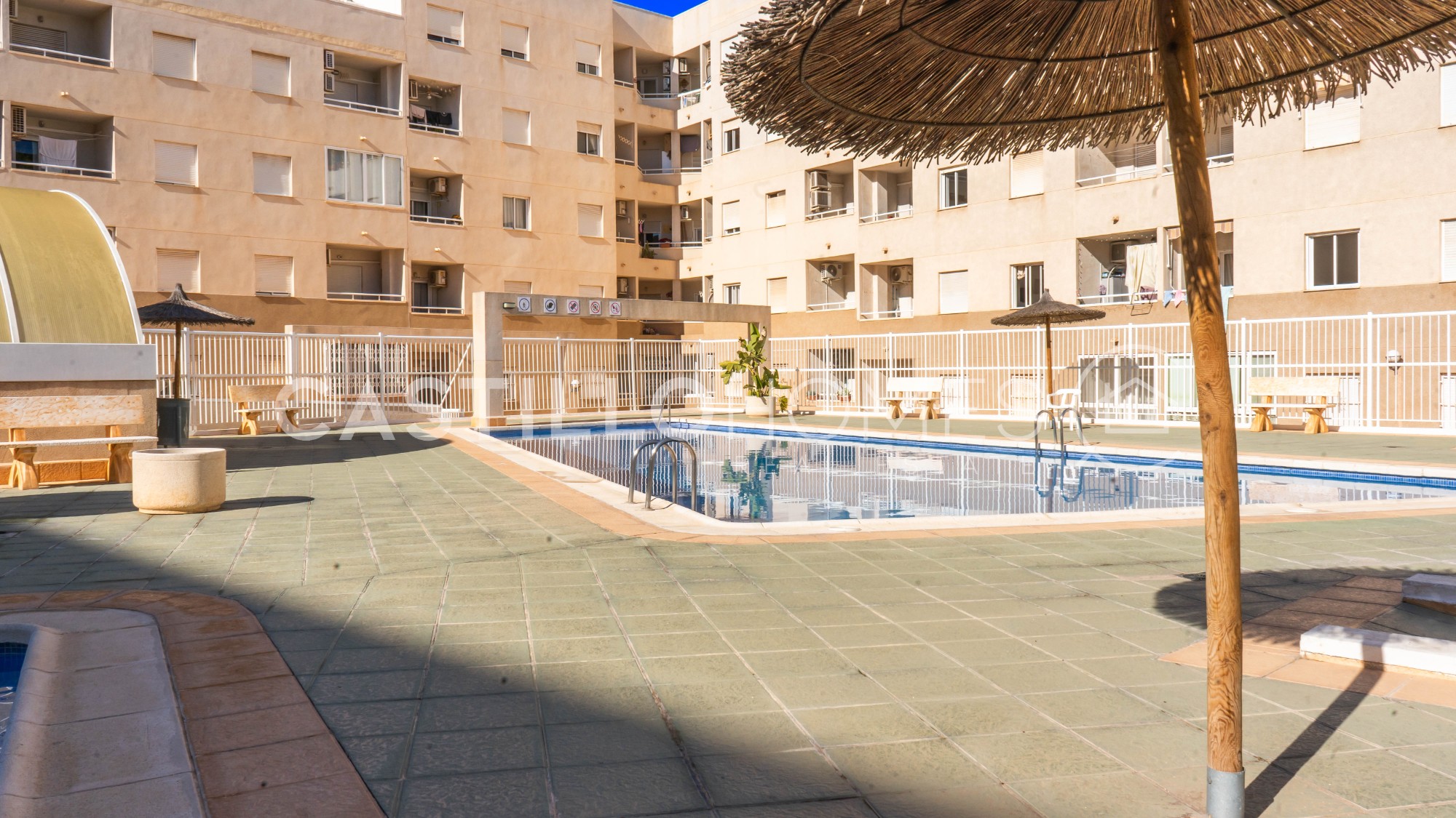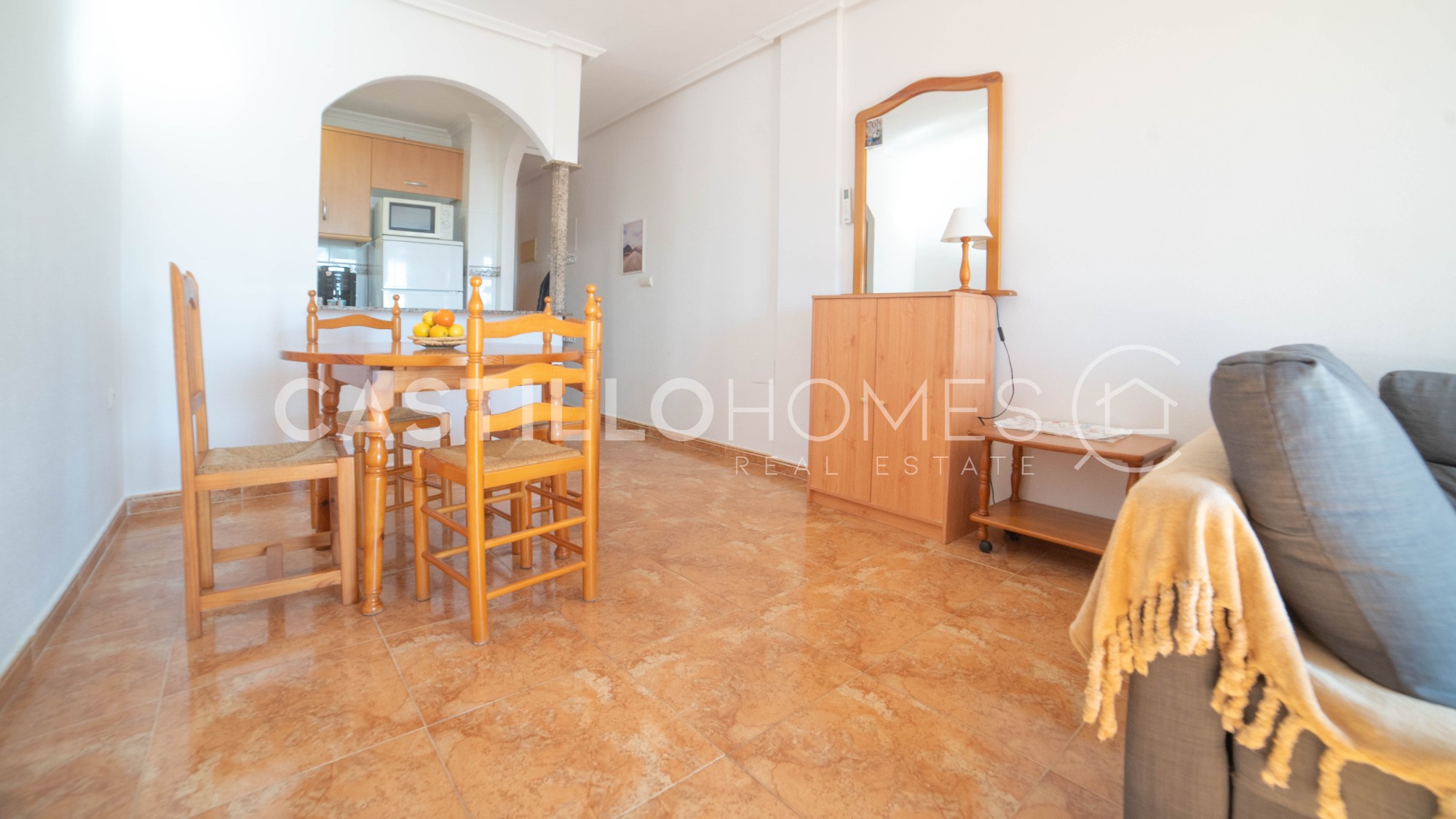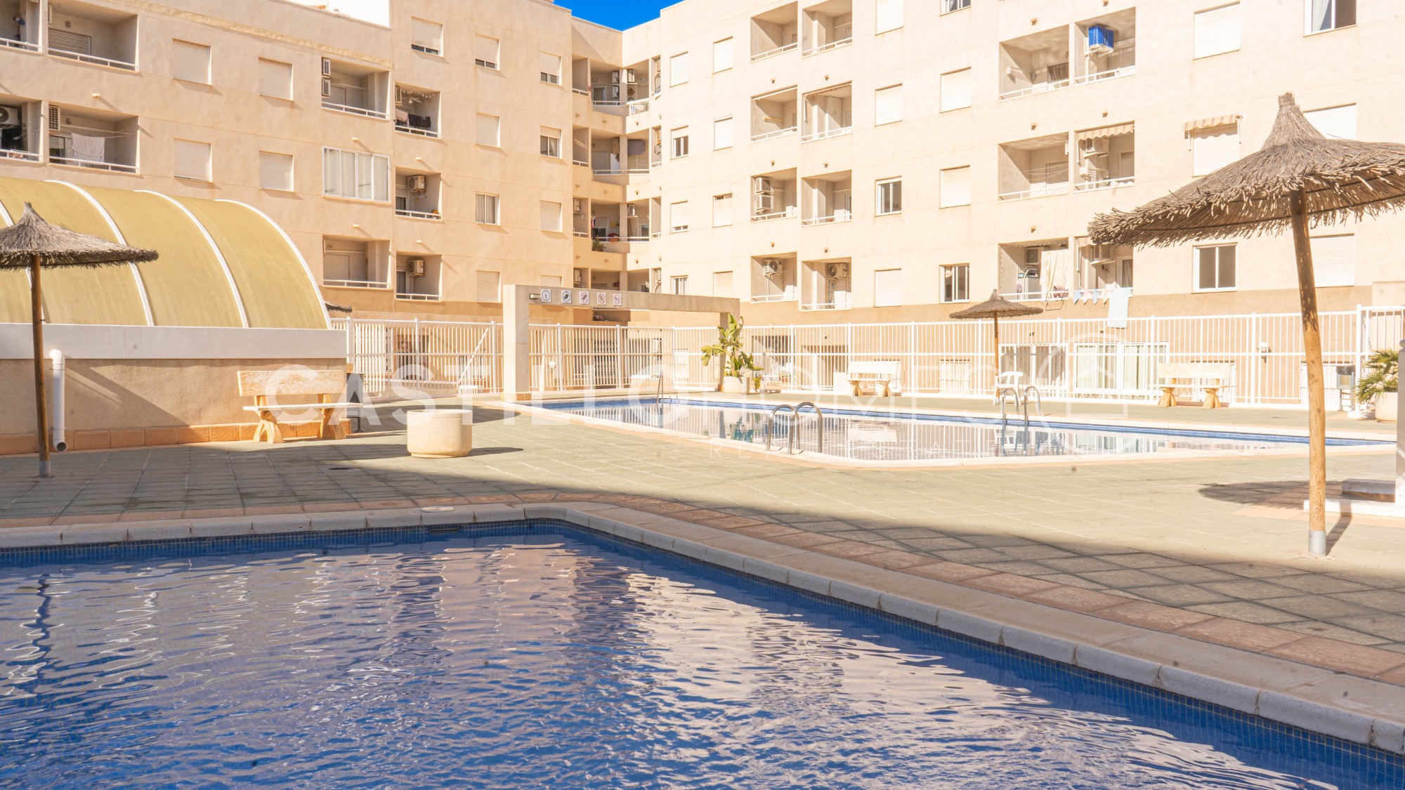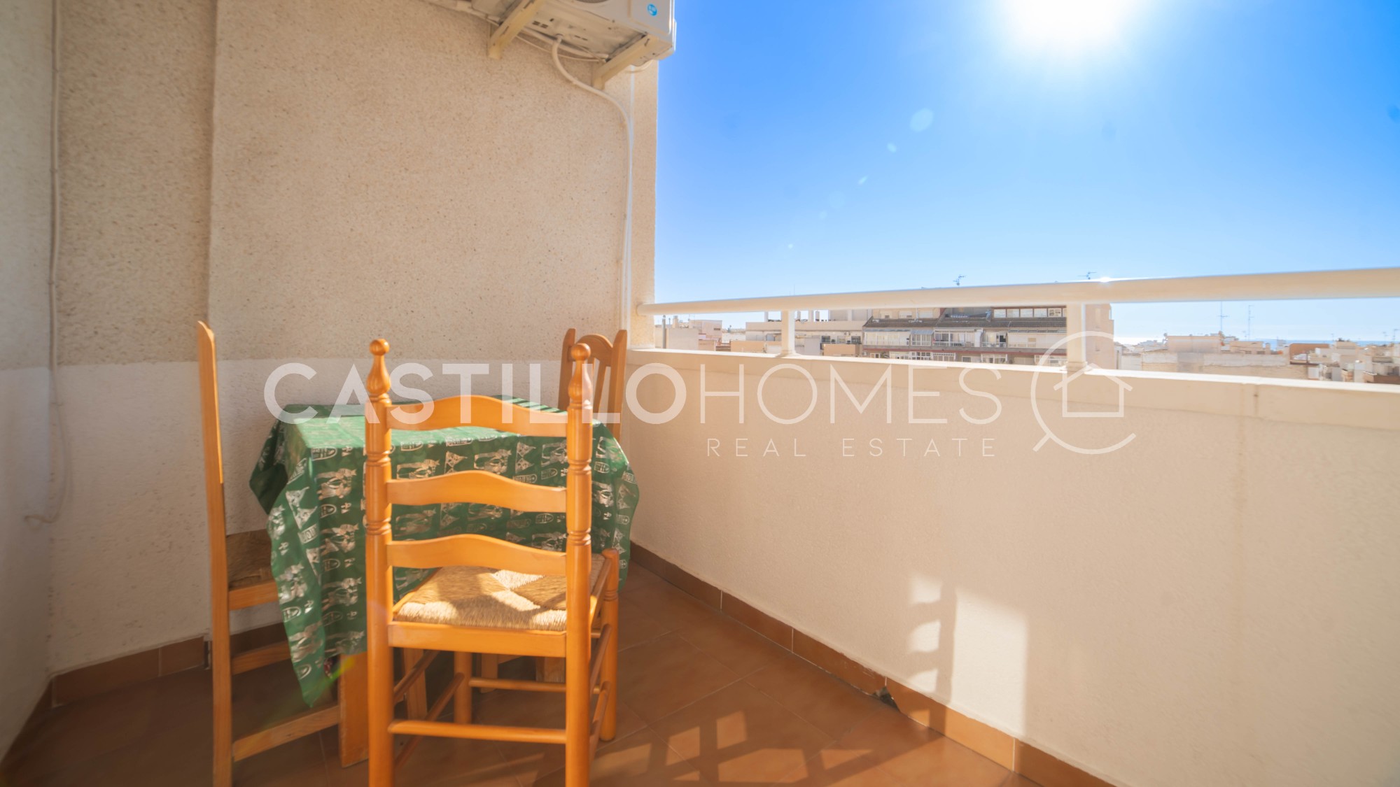 Bright and practical 63 m² apartment on the 4th floor with elevator, ideal for both permanent living and vacation use. The apartment is move-in ready, sold fully furnished, and in its original condition. It has two bedrooms, a bathroom with bathtub, and a spacious living room with a semi-open, fully equipped kitchen that opens onto a south-facing balcony. On the balcony, you can enjoy the sun and a morning coffee while admiring the city and the distant sea on the horizon. The covered balcony allows you to enjoy good weather, and the low neighboring buildings do not obstruct the view. Such a view is rare in the area. The master bedroom window also offers the same views over the city and the distant sea, providing privacy, natural light, and a pleasant perspective. The building has a quiet interior courtyard, two community pools (one for children, with a lifeguard during the season), and CCTV throughout the property, ensuring safety and peace of mind. The location is excellent. In the immediate vicinity of El Molino, the apartment is a short walk from supermarkets (ALDI and Consum about 300 m), a gym (150 m), restaurants, bars, cafés, parks, and playgrounds. Everything you need is within walking distance, and Torrevieja’s port is less than 10 minutes away on foot. Several nearby bus lines connect you to the rest of the city as well as Alicante, Murcia, and Elche. This apartment combines a central location, comfort, city views, and distant sea views, offering excellent value for money. It is perfect for both permanent living and enjoying Costa Blanca year-round. Floor: 4 out of 4 SUMA/IBI (property tax): Pending COMUNIDAD (Association fee) : Pending