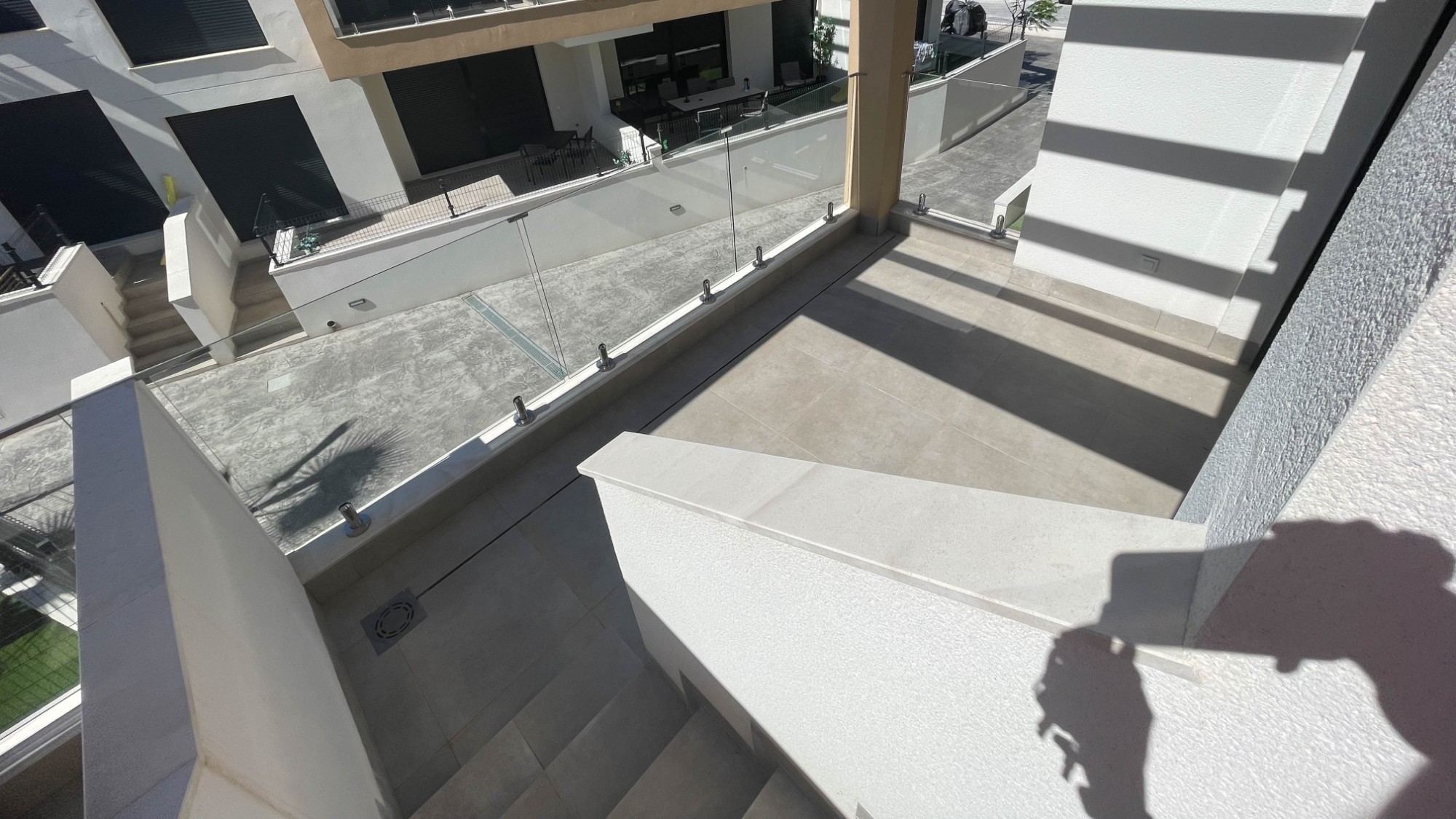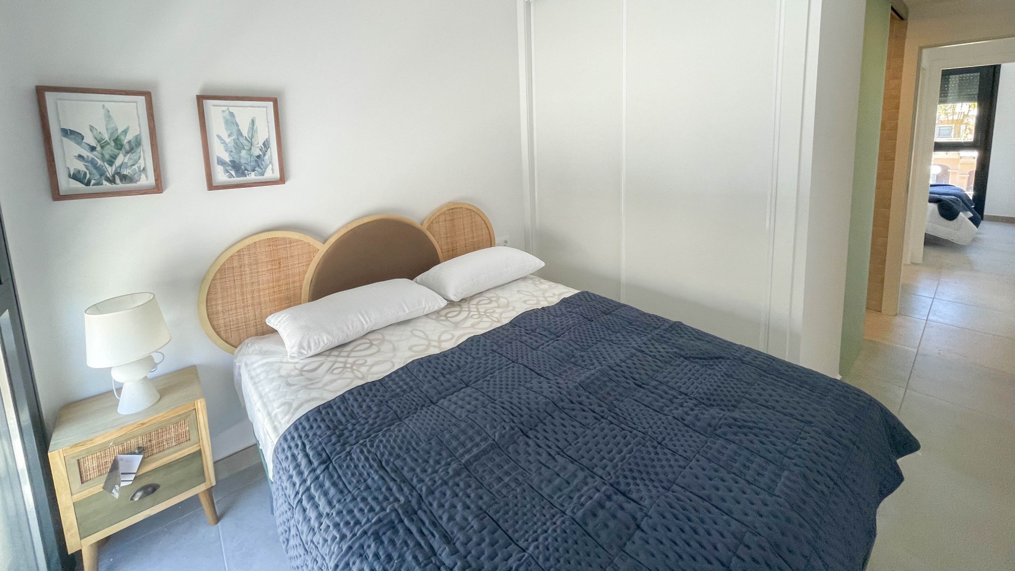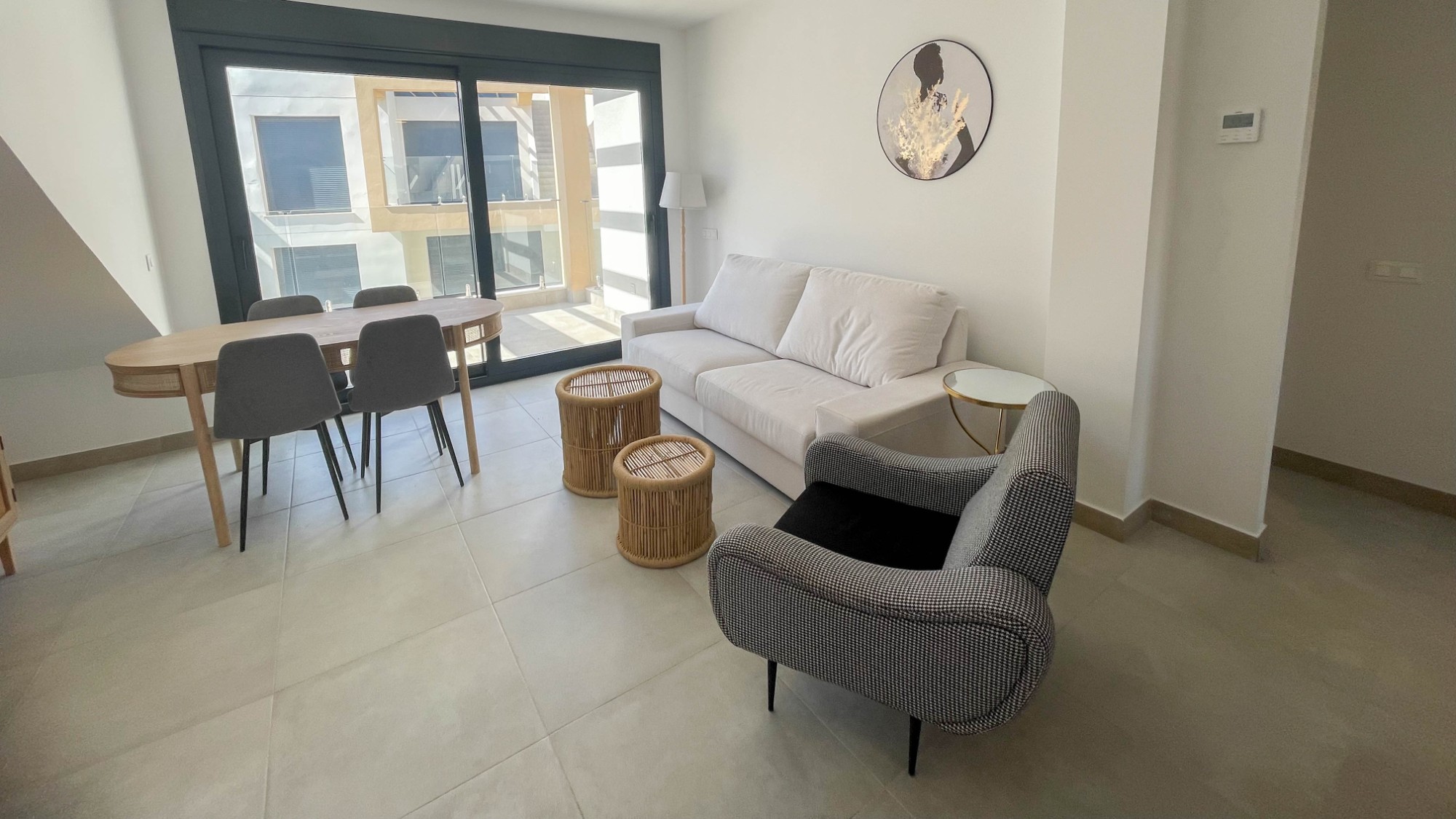 Discover this attractive top-floor apartment, practically brand new, located in the sought-after area of PAU 26 in Orihuela Costa. A property that combines contemporary design, brightness, and outdoor spaces designed to fully enjoy the Mediterranean lifestyle. The home features a private entrance and a functional layout that maximizes comfort and space. It offers two bedrooms with built-in wardrobes and two full bathrooms with modern finishes, including underfloor heating, providing extra comfort throughout the year. The main living area consists of a bright living-dining room with an open-plan kitchen, creating a modern and open atmosphere, ideal for everyday living and entertaining. One of the highlights of this property is its spacious private solarium, a perfect space to create a chill-out area, install an outdoor kitchen, or enjoy the sun all year round. The property is sold partially furnished and equipped with appliances, and also includes air conditioning, allowing immediate use. Located in a well-maintained residential complex, the property offers a communal swimming pool surrounded by green areas, as well as an outdoor parking space included. An excellent opportunity as a permanent residence, holiday home, or investment in one of the most promising areas of Orihuela Costa. Year of construction: 2023 SUMA/IBI (property tax): 300 € per year COMUNIDAD (Association fee): 80€ € per month