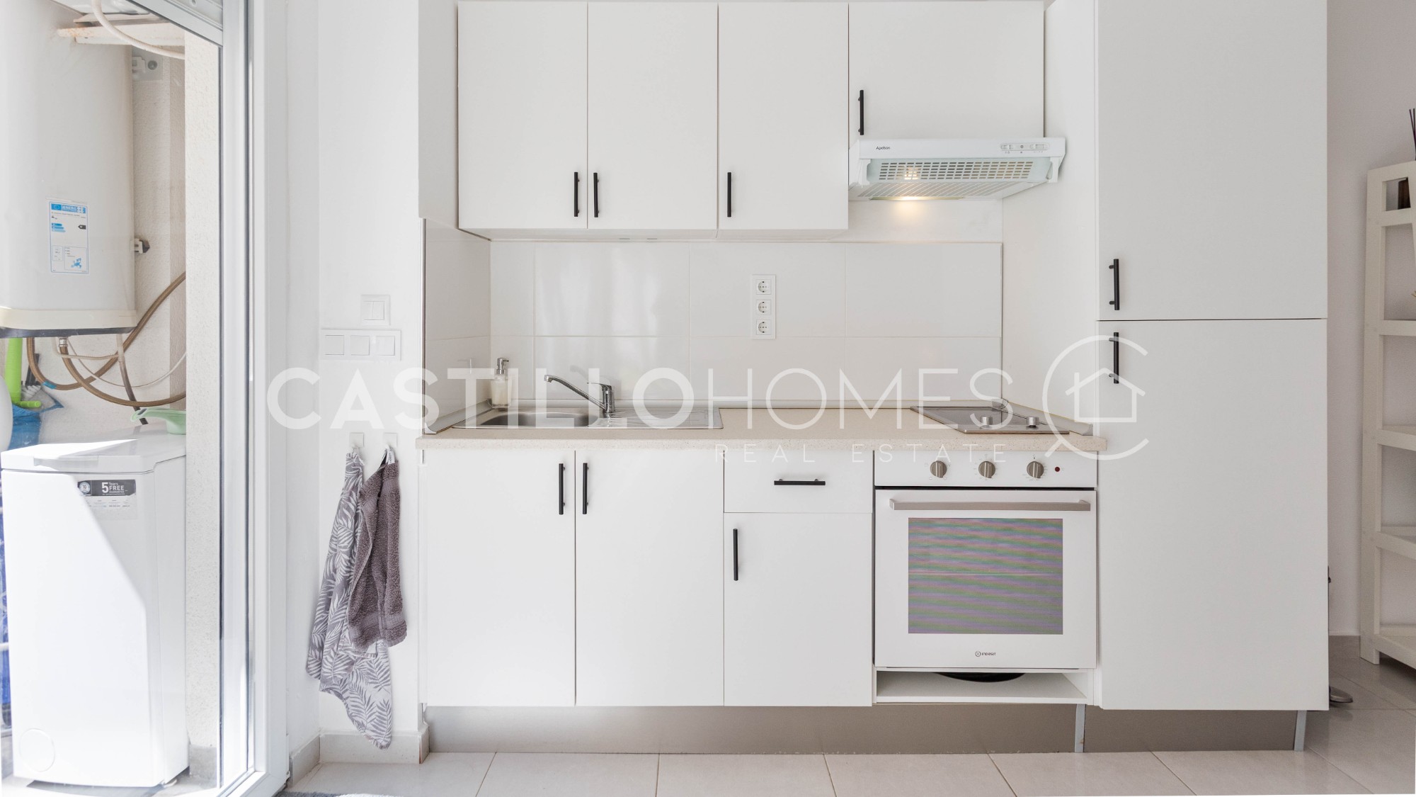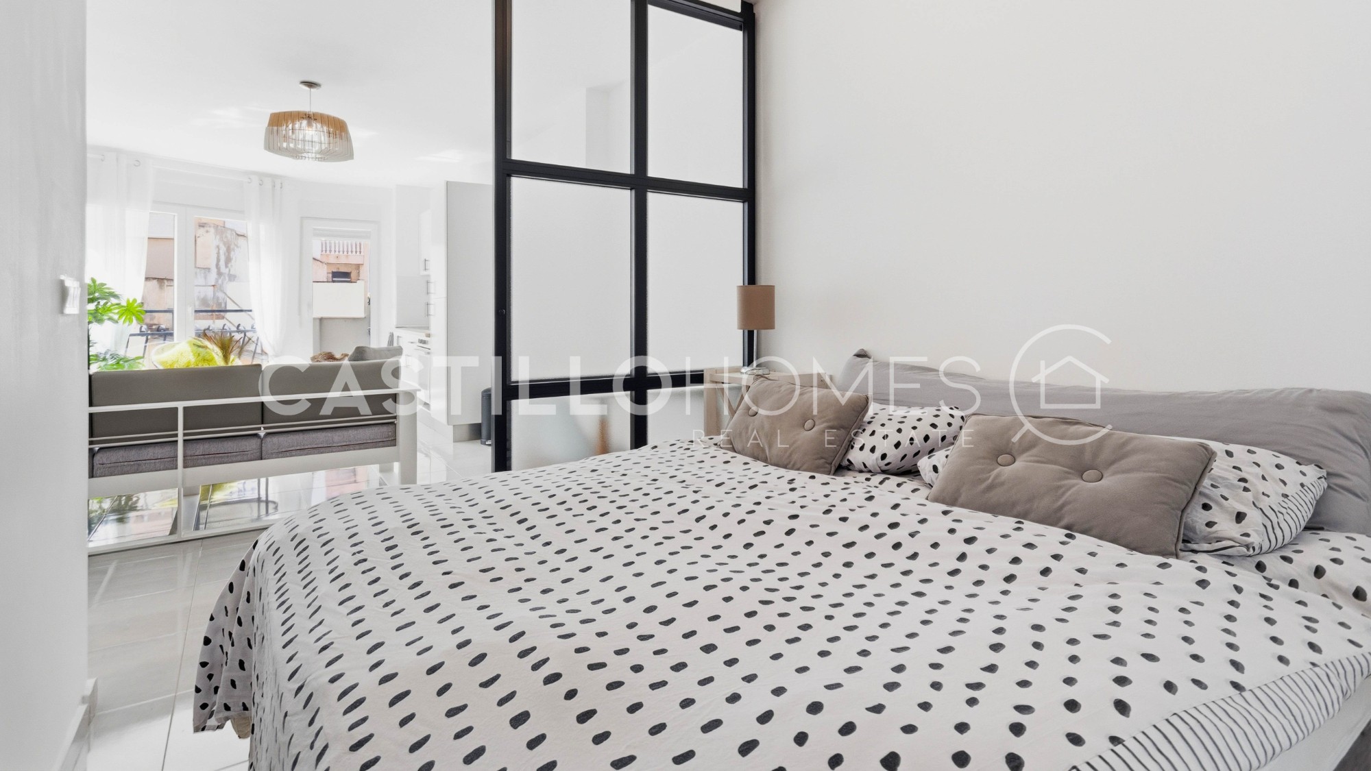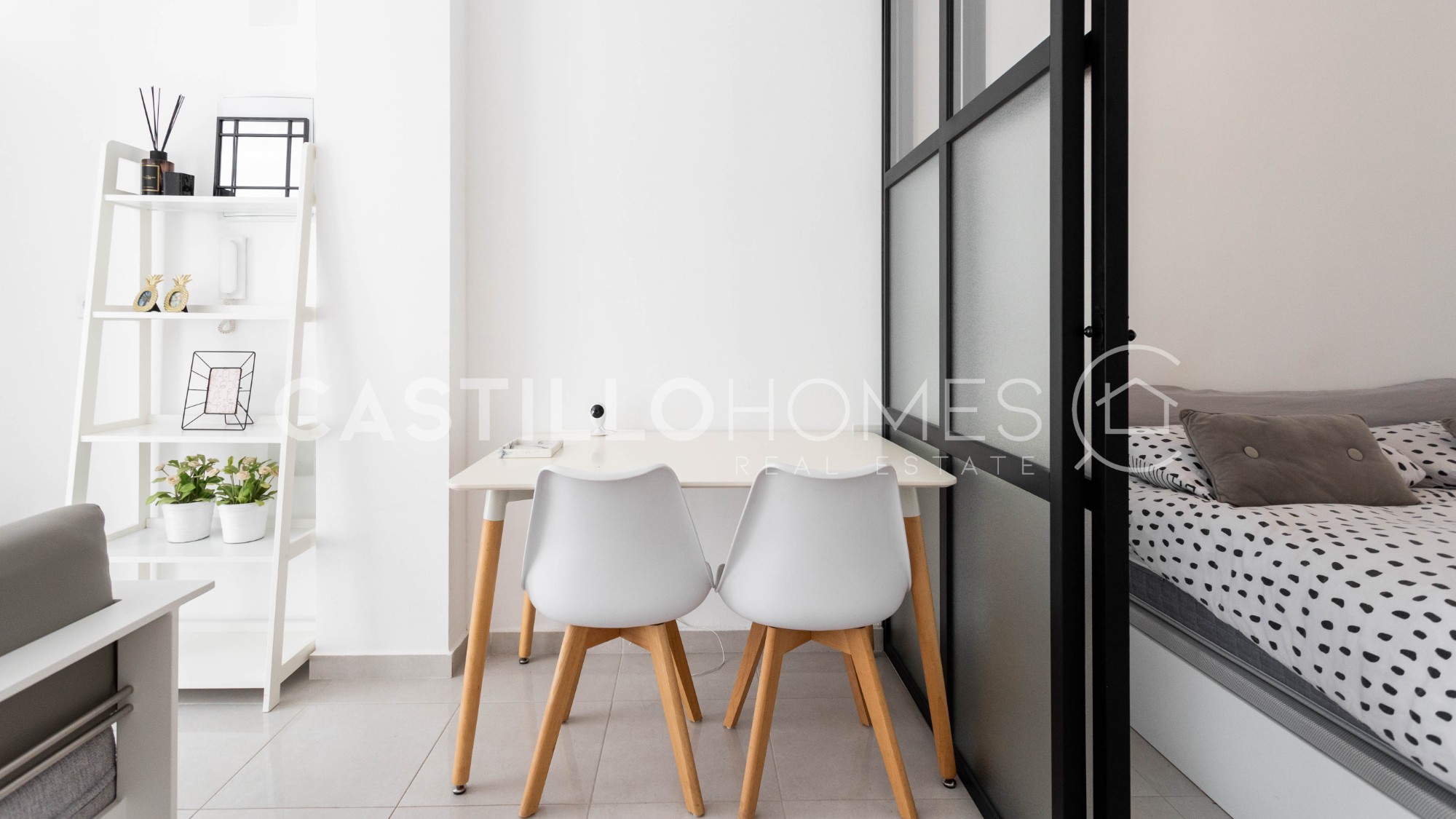 Welcome to this stylish and thoughtfully designed studio in the heart of Torrevieja – a home where design, functionality, and comfort come together beautifully. Every square meter has been carefully used to create a space that feels both inviting and surprisingly spacious. The modern renovation features carefully selected materials and furnishings that create a calm and cohesive atmosphere throughout. The generous natural light truly defines this home. Large windows, which can be opened like doors, allow sunlight to flood in and create a seamless connection between indoor and outdoor living. It’s the perfect spot to enjoy a morning coffee or relax in the sun during the day. A standout feature is the sliding frosted glass doors that separate the sleeping area. When closed, they create the feeling of a private bedroom, while still allowing light to flow through. When opened, the space returns to its airy, open-plan layout – offering the best of both worlds. Smart storage solutions are integrated throughout, including built-in wardrobes, mirrored details that enhance the sense of space, and a bed with additional storage. The community also offers a rooftop terrace with a pool – ideal for sunny days, refreshing swims, or simply relaxing with a good book. The location is unbeatable. Everything you need is just outside your door – restaurants, cafés, supermarkets, and services. The central bus station and taxis are nearby, and within a short walk you’ll reach the beach and promenade. A perfect home for holidays or year-round living – small in size, big in feeling. Floor: 1 / 4 SUMA/IBI (property tax): 158,02 € per year COMUNIDAD (Association fee) : 59,33 € per month