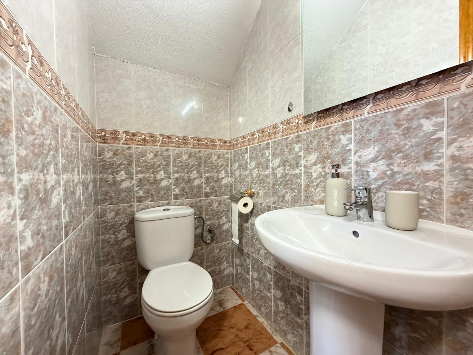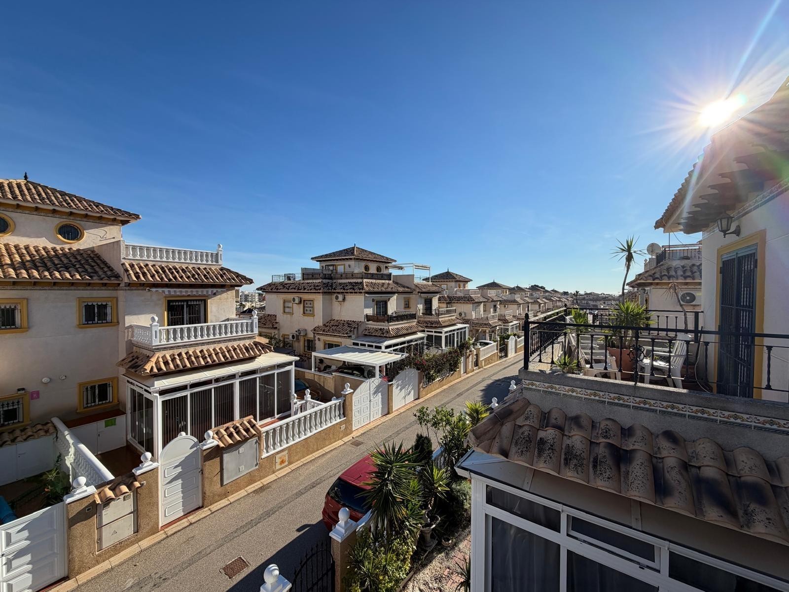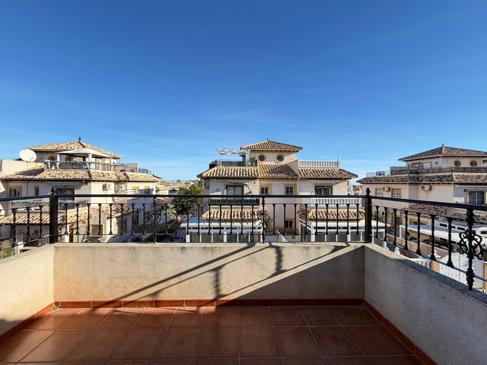 This lovely townhouse is for sale in the peaceful Las Filipinas area of Orihuela Costa, within a well-maintained residential complex with a communal pool and pleasant gardens. It's the perfect home for year-round living or enjoying holidays on the coast. The property is in excellent condition thanks to a recent cosmetic renovation, so it's ready to move into without needing any further improvements. The house has 82 m² built (74 m² usable space) on a 67 m² plot, and features 2 bedrooms and 2 bathrooms, offering comfortable and functional spaces. Outside, the glazed terrace at the entrance is a highlight, ideal for breakfast, relaxing, or enjoying the area's excellent climate year-round. Furthermore, it boasts a solarium and terrace totaling 20 m², offering magnificent open views of the mountains and the sea, creating a perfect space for sunbathing or enjoying pleasant evenings outdoors. Air conditioning in all rooms, a spacious enclosed terrace at the entrance, parking within the plot, a large storage room, and the property comes fully furnished and equipped with appliances, as shown in the photographs. The property is located just 6 km from the beaches of Orihuela Costa, in a quiet residential area yet close to all amenities, golf courses, shops, and leisure facilities. The complex offers a communal swimming pool, landscaped green areas, and a peaceful atmosphere. An excellent opportunity for those seeking a move-in ready home in one of the most sought-after areas of the Alicante coast, whether as a permanent residence, holiday home, or investment property. SUMA/IBI (property tax): 191€ per yearCOMUNIDAD (Association fee) : 48,3€ per month