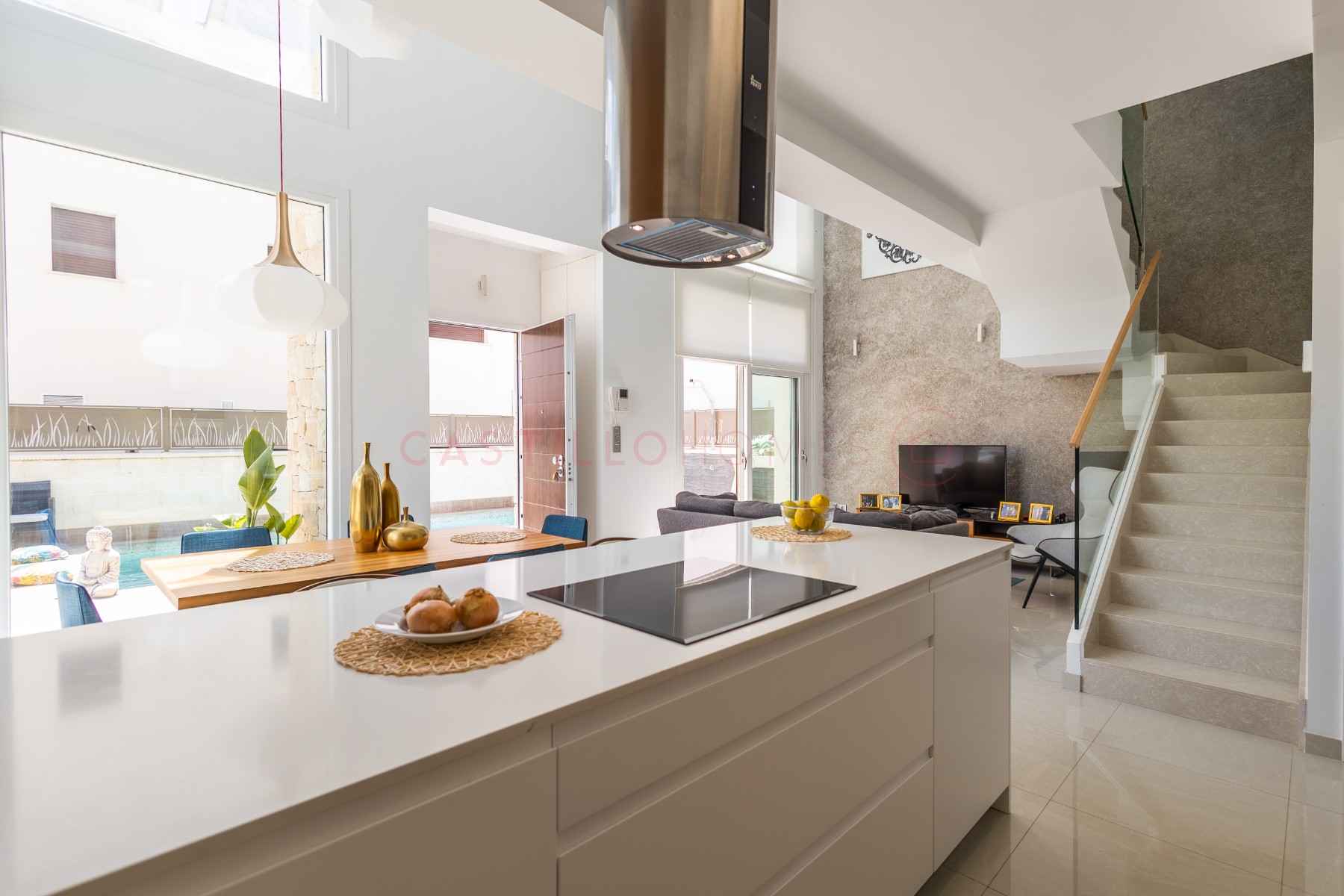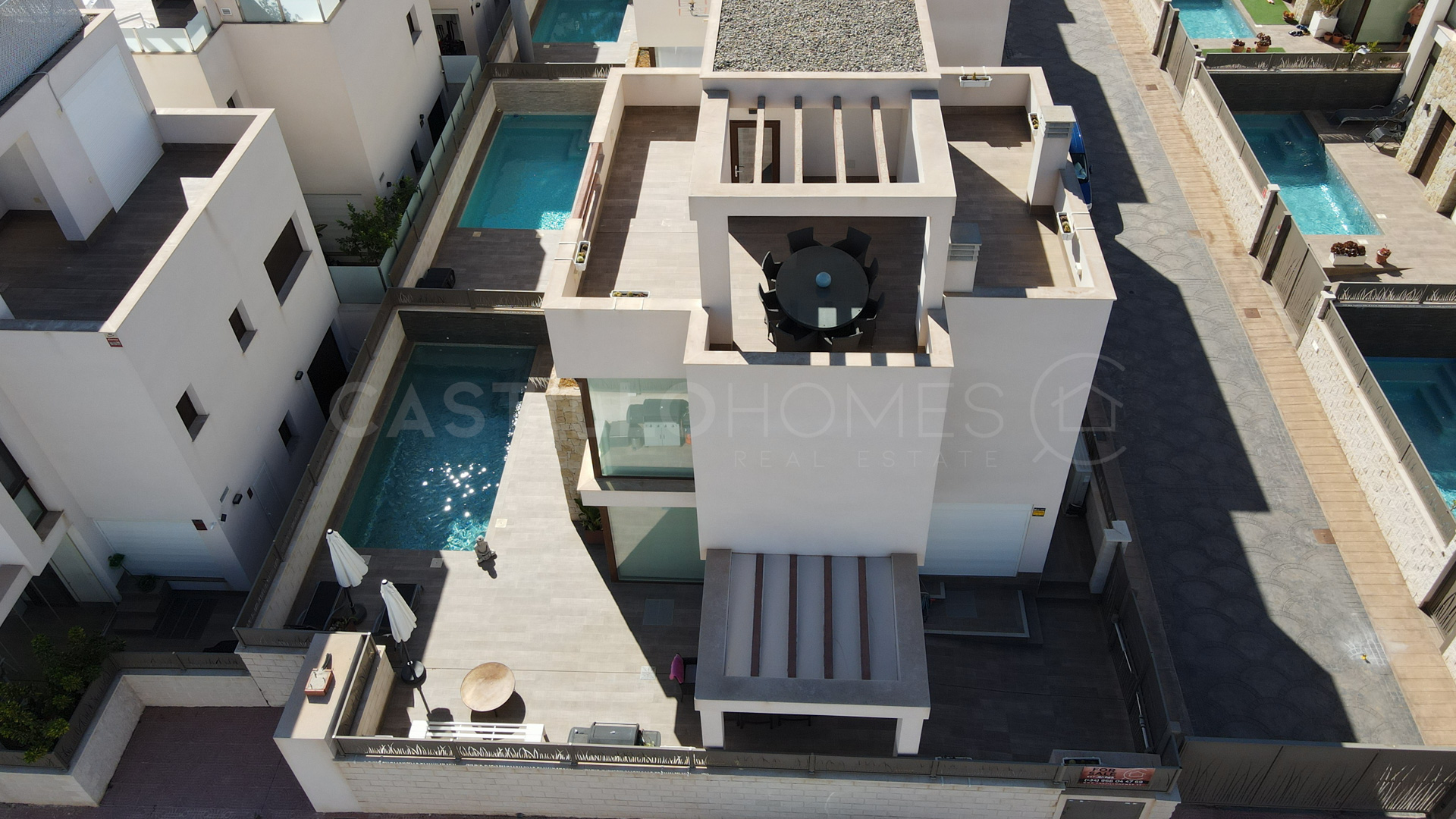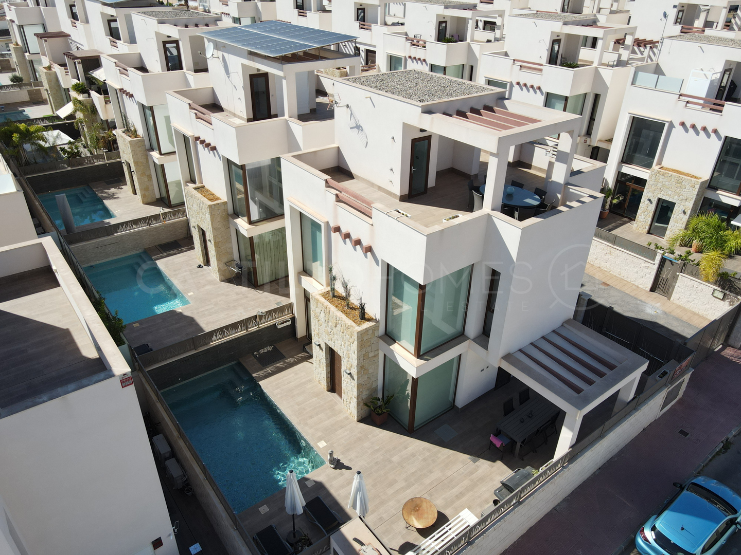 Discover this magnificent property located in Ciudad Quesada, just 6 km away from the beautiful beaches of Guardamar and near one of the most stunning golf courses in the region, La Marquesa Golf, which will delight golf enthusiasts. Additionally, the renowned La Finca Golf course is also nearby. You can enjoy the pleasures of the game while relaxing in an enchanting setting. This four-sided villa offers much more than incredible views of the neighborhood and the Torrevieja lagoon from its solarium. Once inside, you will be greeted by a spacious and bright living room, thanks to its large windows. The refined and detail-oriented decoration adds a touch of elegance to the entire space. On the ground floor, you will find a living room, a dining area, and an open kitchen, fully equipped with high-end appliances. A bathroom with an Italian shower and a generously sized bedroom complete this floor. Moreover, this property features a large basement transformed into a game room, with a bar and a billiard table, offering an ideal entertainment space to spend time with family or friends. On the first floor, two beautiful and spacious additional bedrooms await you, each with an ensuite bathroom equipped with an Italian shower. All three bedrooms have built-in wardrobes with integrated LED lights and flat-screen TVs. Finally, the top floor offers a spacious private solarium, with a pre-installed summer kitchen and the possibility of installing a jacuzzi. You can enjoy an incredible view of the surroundings from this outdoor space. SUMA/IBI (property tax): 178 € per year COMUNIDAD (Association fee) : pending